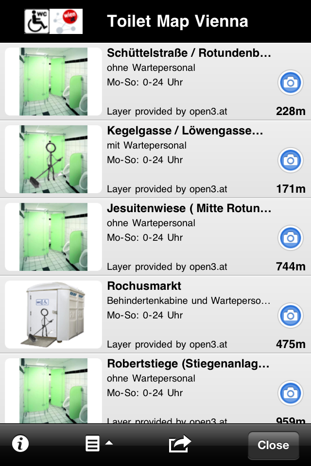 Um zu zeigen, dass Open Data kein rein technisches Thema ist, sondern ein breites Spektrum umfasst, habe ich eine erste Applikation basierend auf diesen Daten erstellt: die “Toilet Map Vienna”. Diese stellt Geokoordinaten der 298 öffentlichen WCs auf dem Augmented-Reality-Browser Layar dar, der mittels Smartphone aufgerufen werden kann und abhängig vom aktuellen Standort die WCs in der Umgebung anzeigt. Eine Auswahl nach Kategorien (zB WCs mit Behindertenkabine) ist ebenso möglich wie die Berechnung der Route via Google Maps.